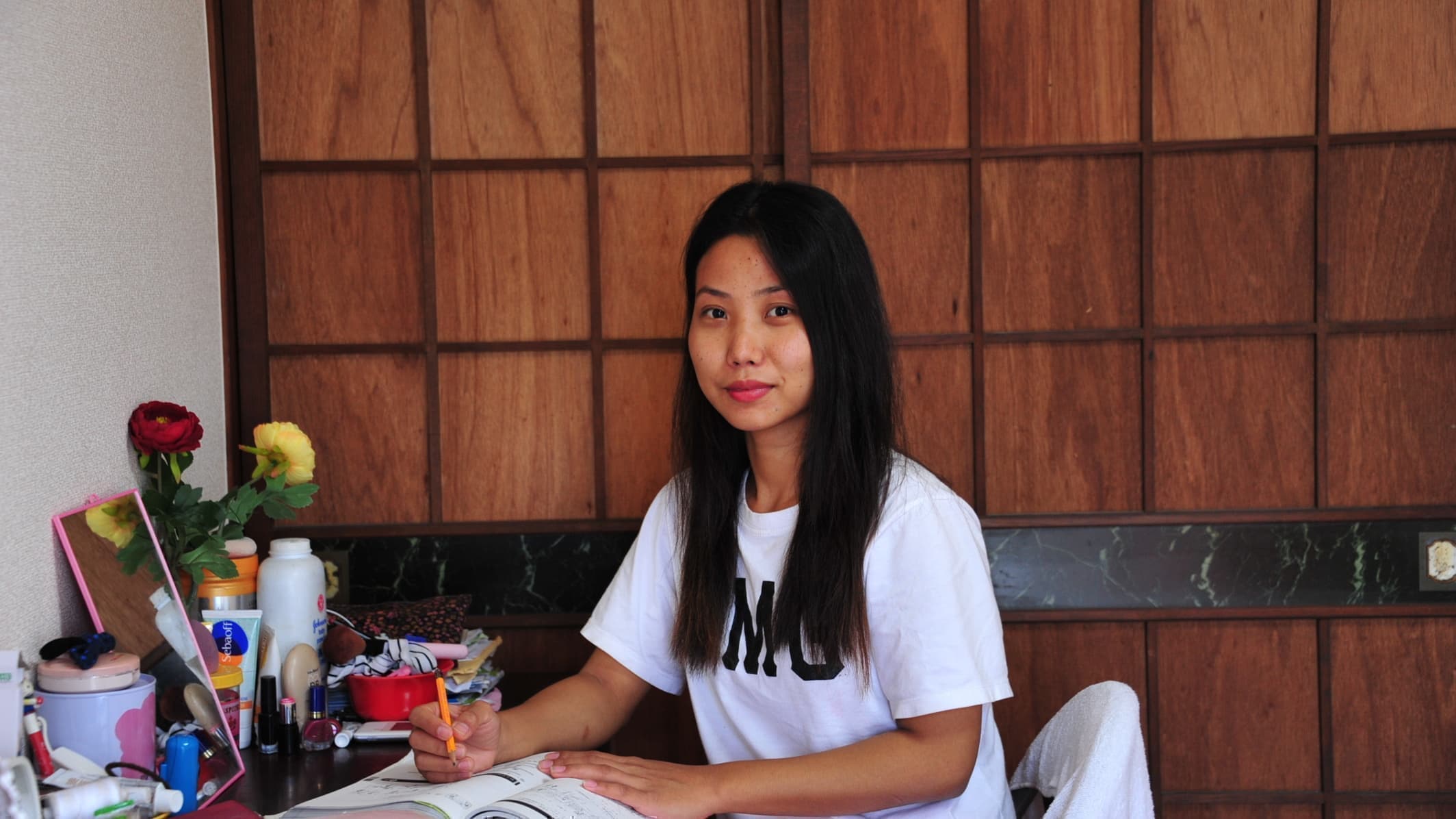 我现在住在明日香日语学校的宿舍。我宿舍从学校需要10分钟。每个房间都备齐浴室、厨房、洗衣机、床、餐具等生活必需品,刚来日本的留学生也能很快适应这里的生活。